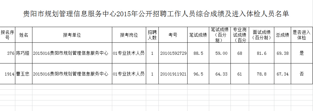 贵阳市规划管理信息服务中心2015年公开招聘工作人员综合成绩及进入体检人员名单
